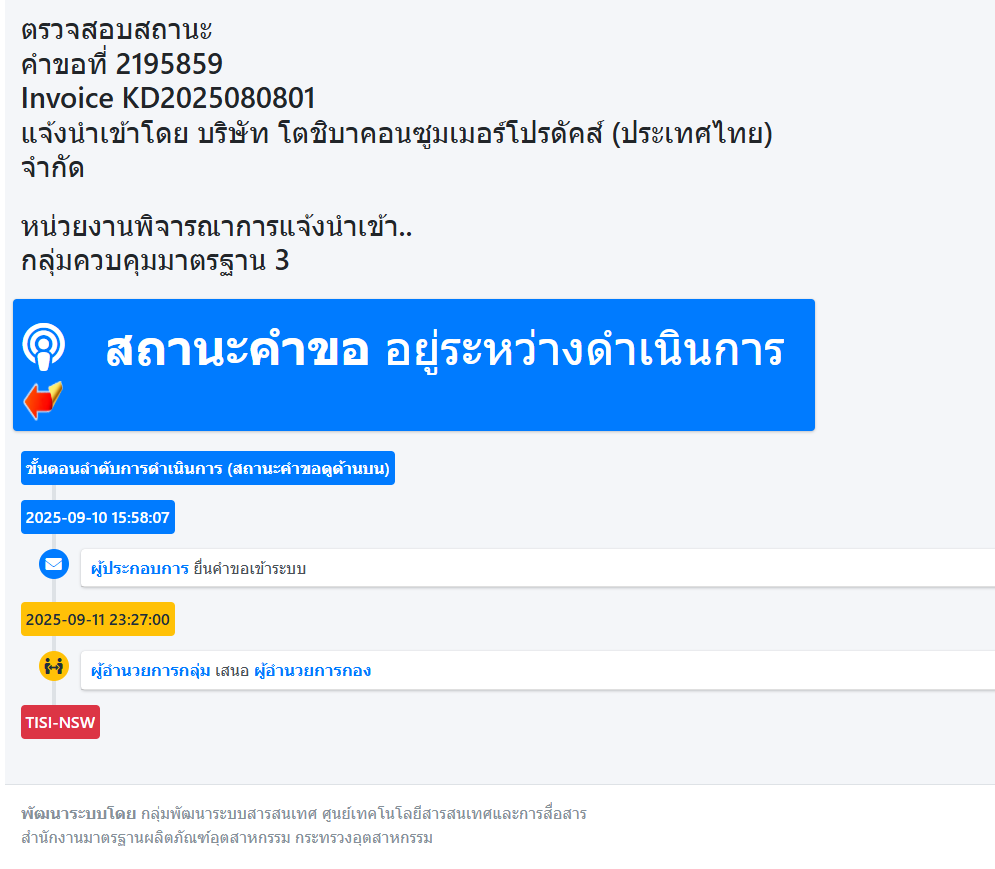 แจ้งนำเข้าโดย บริษัท โตชิบาคอนซูมเมอร์โปรดัคส์ (ประเทศไทย) จำกัด