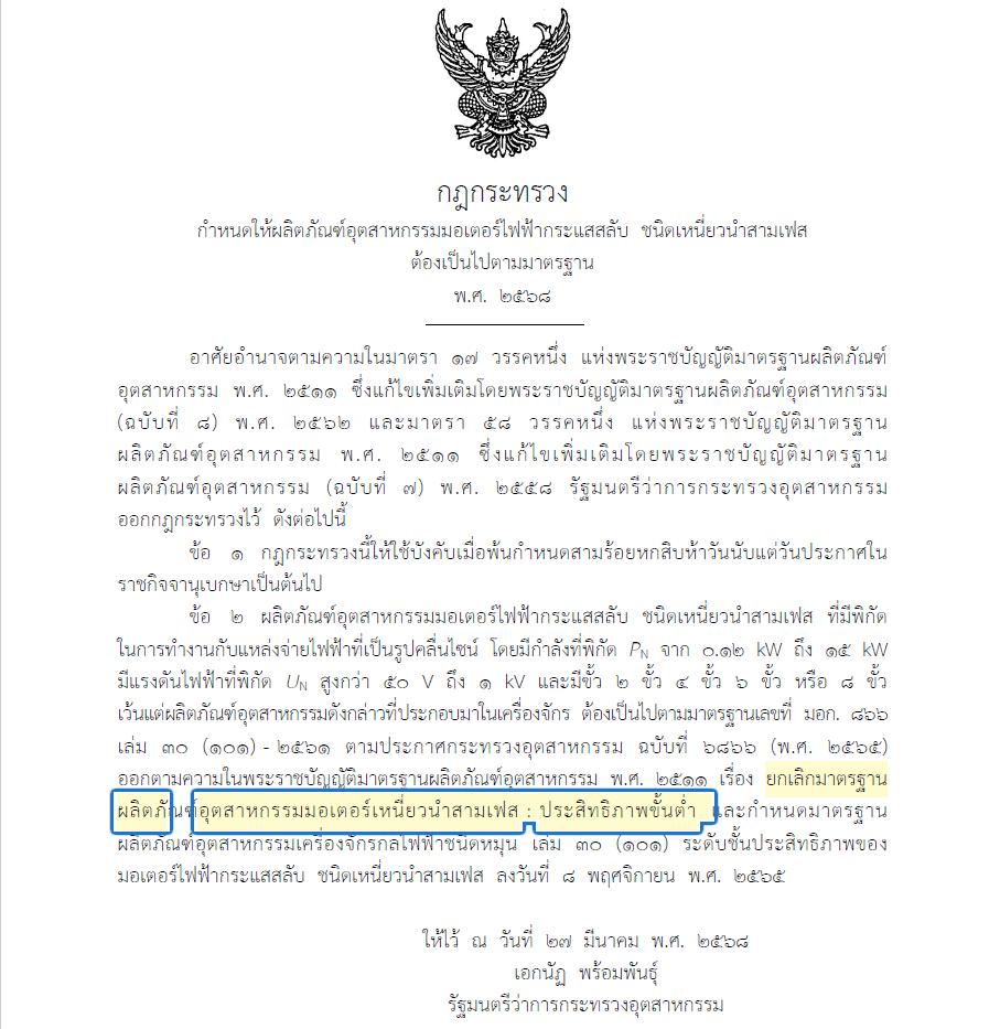 อ้างอิงข้อกำหนดตามประกาศกฎกระทรวงด้านล่าง คำนิยาม :ยกเลิกมาตรฐานผลิตภัณฑ์อุตสาหกรรมมอเตอร์เหนี่ยวนำสามเฟส:ประสิทธิภาพต่ำ