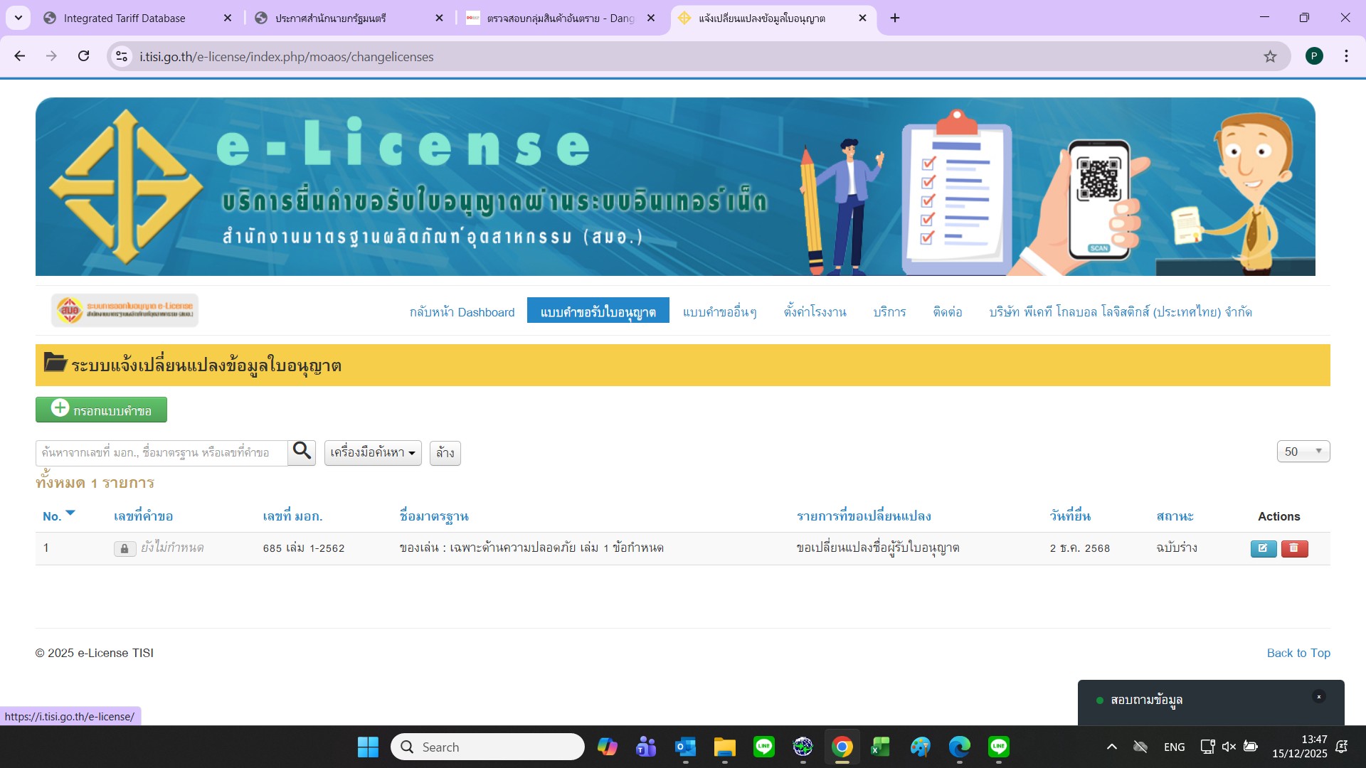 บริษัทฯ ได้ทำการยื่นเรื่องขอเปลี่ยนแปลงข้อมูลผู้รับใบอนุญาต มอก. นำเข้า ของเล่น เนื่องจากบริษัทมีการเปลี่ยนแปลงชื่อบริษัท ได้ทำยื่นเรื่องในระบบแล่ว สามารถพิจารณาแล้วเสร็จภายในกี่วัน เนื่องจากมีสินค้ากำลังนำเข้าครับ