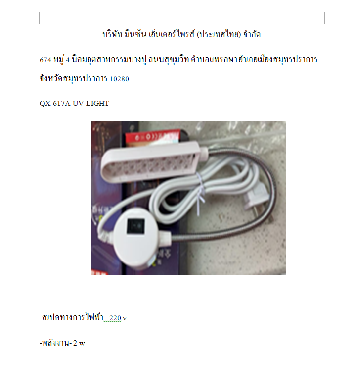 พอดีว่าผมจะยื่นขอโคมไฟเเละหลอดไฟ UV LAMP QX-617 สเปคทางการไฟฟ้า- 220 v-พลังงาน- 7 w QX-617A UV LIGHT สเปคทางการไฟฟ้า- 220 v -พลังงาน- 2 w