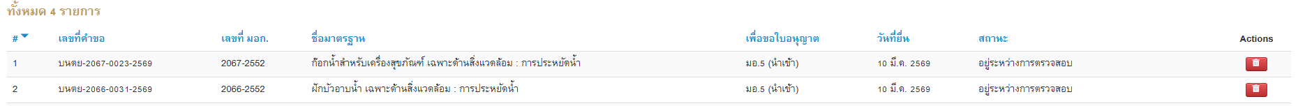 สวัสดีค่ะ เนื่องจากได้ยื่นคำขอทดสอบผลิตภัณฑ์ มอก.2067-2552 กับมอก.2066-2552 ไปเมื่อ10มีนา จนถึงตอนนี้ยังไม่มีอะไรอัปเดทเลยค่ะ ไม่แน่ใจว่าต้องรอระบบกี่วัน แต่อันนี้อยู่ที่เดิม ยังไงฝากเช็คความถูกต้องแล้วแจ้งกลับที่